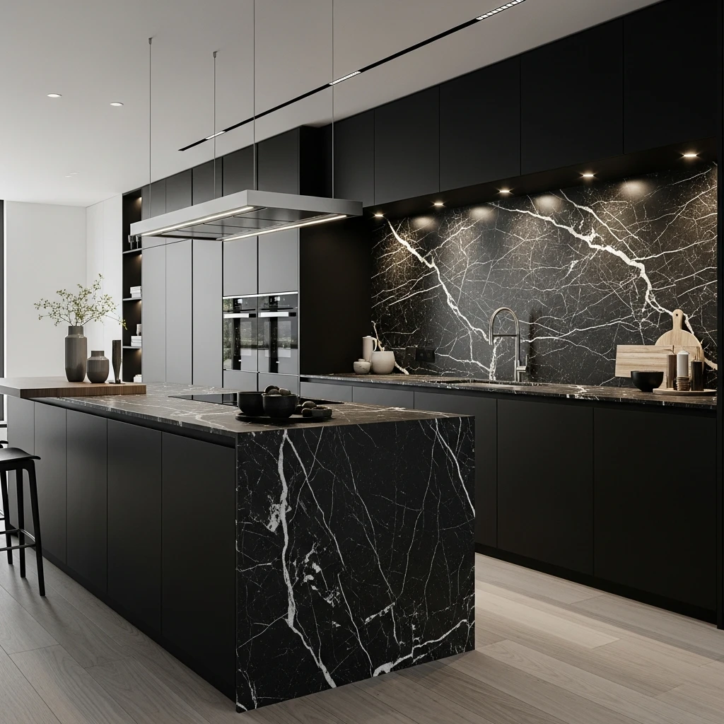 Stone is another lovely pairing. Whether matte, honed, or lightly polished, it creates movement and depth, especially when placed next to smooth black surfaces. Even smaller elements, like metal handles or subtly patterned tiles, can add character without overwhelming the design.
