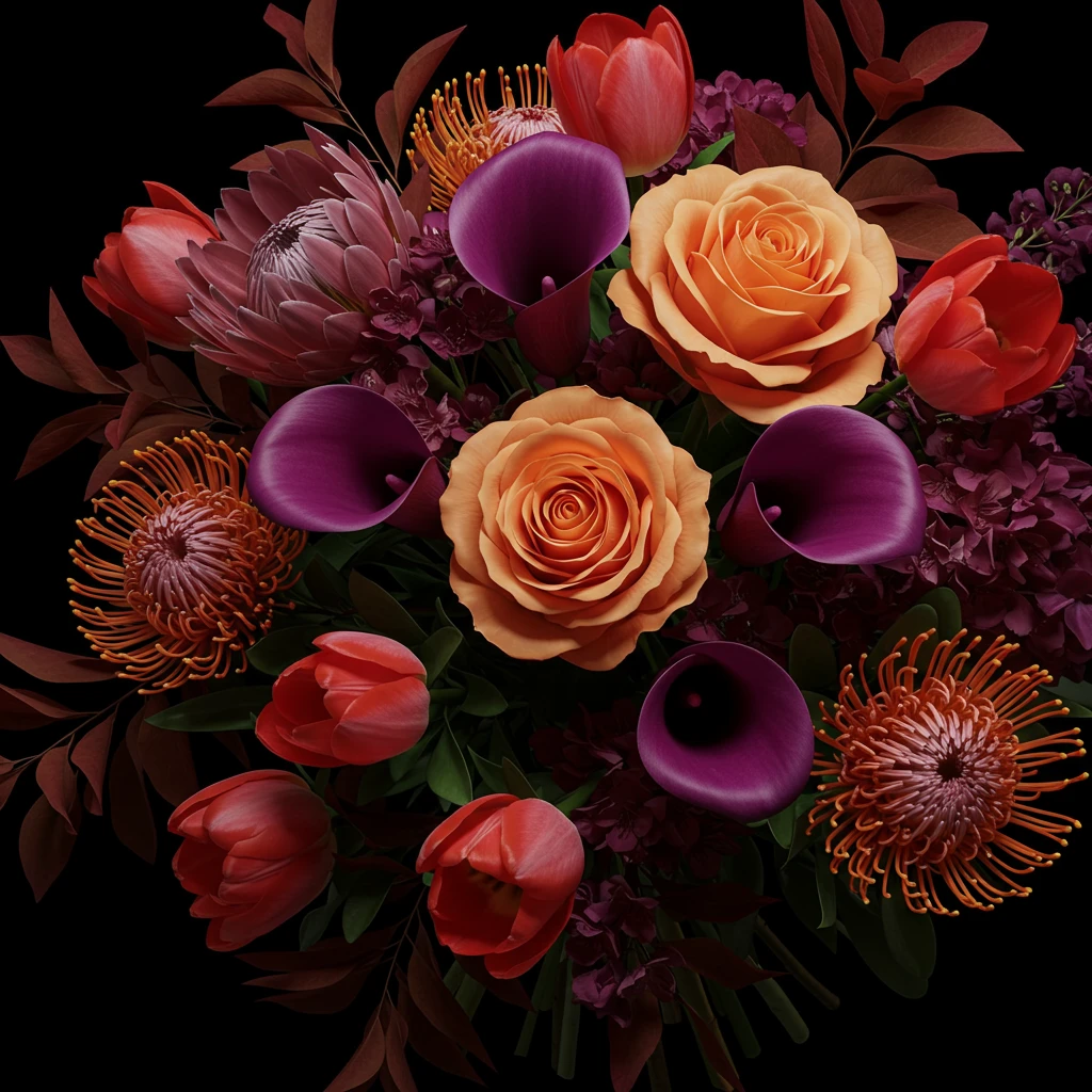 Purple accents often enhance this mix. They provide contrast, deepening the arrangement with cooler tones. This balance of warm and cool hues reflects the complexity of fall colors. It results in bouquets that feel layered and dynamic.