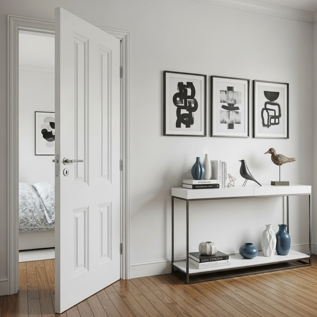 Design style plays a huge role in how a white door transforms a room. Even with the same colour, the panel layout, gloss level, and texture change the mood dramatically.
